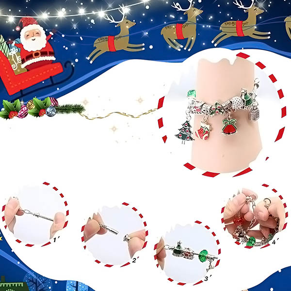- Ziemassvētku Adventes kalendārs, kas ietver 22 piekariņus un 2 aproces, lai izveidotu divas burvīgas rokassprādzes.