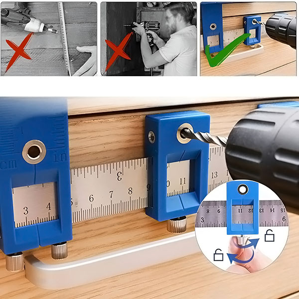Ar regulējamu lineālu, kas ļauj ātri veikt mērījumus un viegli veikt regulējumus, jūs varat viegli izvietot urbšanas punktus. Neatkarīgi no tā, vai strādājat ar koku, metālu vai plastmasu, bīdāmie marķieri un milimetru skala padara pozicionēšanu vieglu.