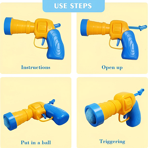 1x bumbiņu palaišanas ierīce, 20 krāsainas plīša bumbiņas