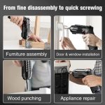 🔧 Elastīgs vārpsts šaurām vietām – sasniedz leņķus un vietas, kur standarta skrūvgriezis netiek, ideāli mēbeļu montāžai, ierīču remontam un mājas uzturēšanai