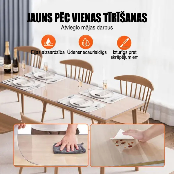 Atjauniniet savu ēdamistabas telpu ar mūsu augstākās kvalitātes PVC galda pārklāju. Tas ir izstrādāts, lai saglabātu jūsu galdu nevainojamā stāvoklī, piedāvājot izcilu aizsardzību pret skrāpējumiem, izšļakstījumiem un citiem bojājumiem.