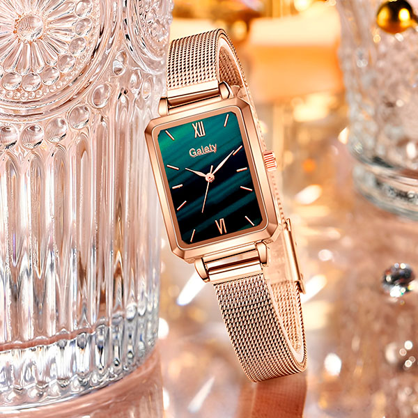 Šim pulkstenim ir spīdīga rožu zelta krāsa un skaista zaļa ciparnīca. Tas piešķir stilu jebkurai kleitai, džinsiem vai svinīgam apģērbam.