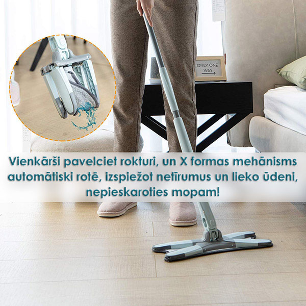 Aizmirstiet par slapjiem mopiem un netīrām rokām! Mūsu modernā pašizgriešanas sistēma atdarina roku izspiešanu, noņemot 2x vairāk ūdens nekā tradicionālie mopi, nodrošinot ātrāku un vieglāku tīrīšanu!